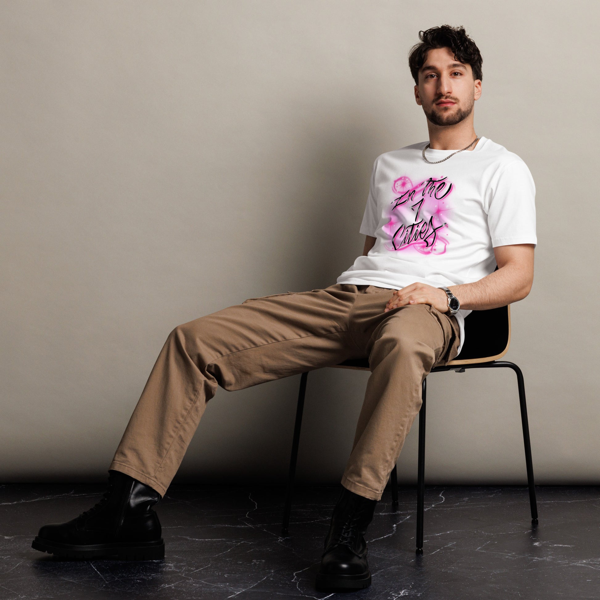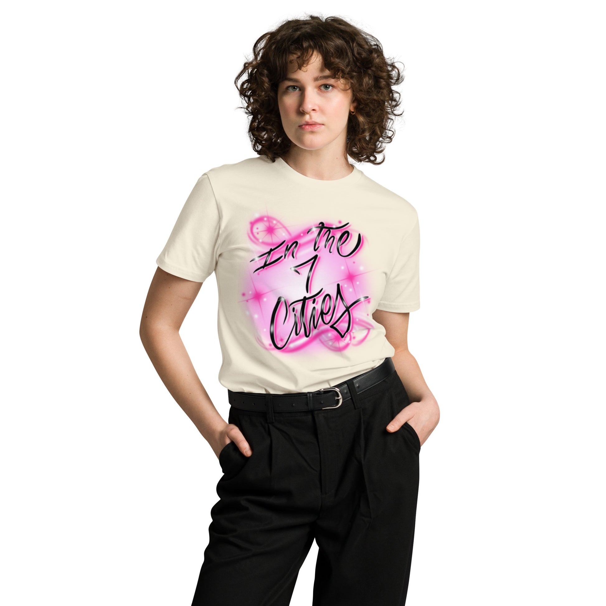 Pink spray on T-shirt with the words “In The 7 Cities.” Wrap yourself in comfort with this premium tee. It’s made of 100% combed cotton and has a soft, luxurious feel. The t-shirt’s regular fit and crew neck boast a timeless look. The fabric is pre-shrunk to maintain its size and shape wash after wash. Style it up or down to suit any occasion.